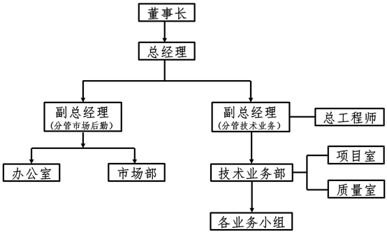 公司組織構(gòu)架設(shè)置為一辦兩部,即辦公室、市場部、技術(shù)業(yè)務(wù)部。技術(shù)業(yè)務(wù)部下設(shè)項(xiàng)目室和質(zhì)量室,并設(shè)置若干業(yè)務(wù)小組。